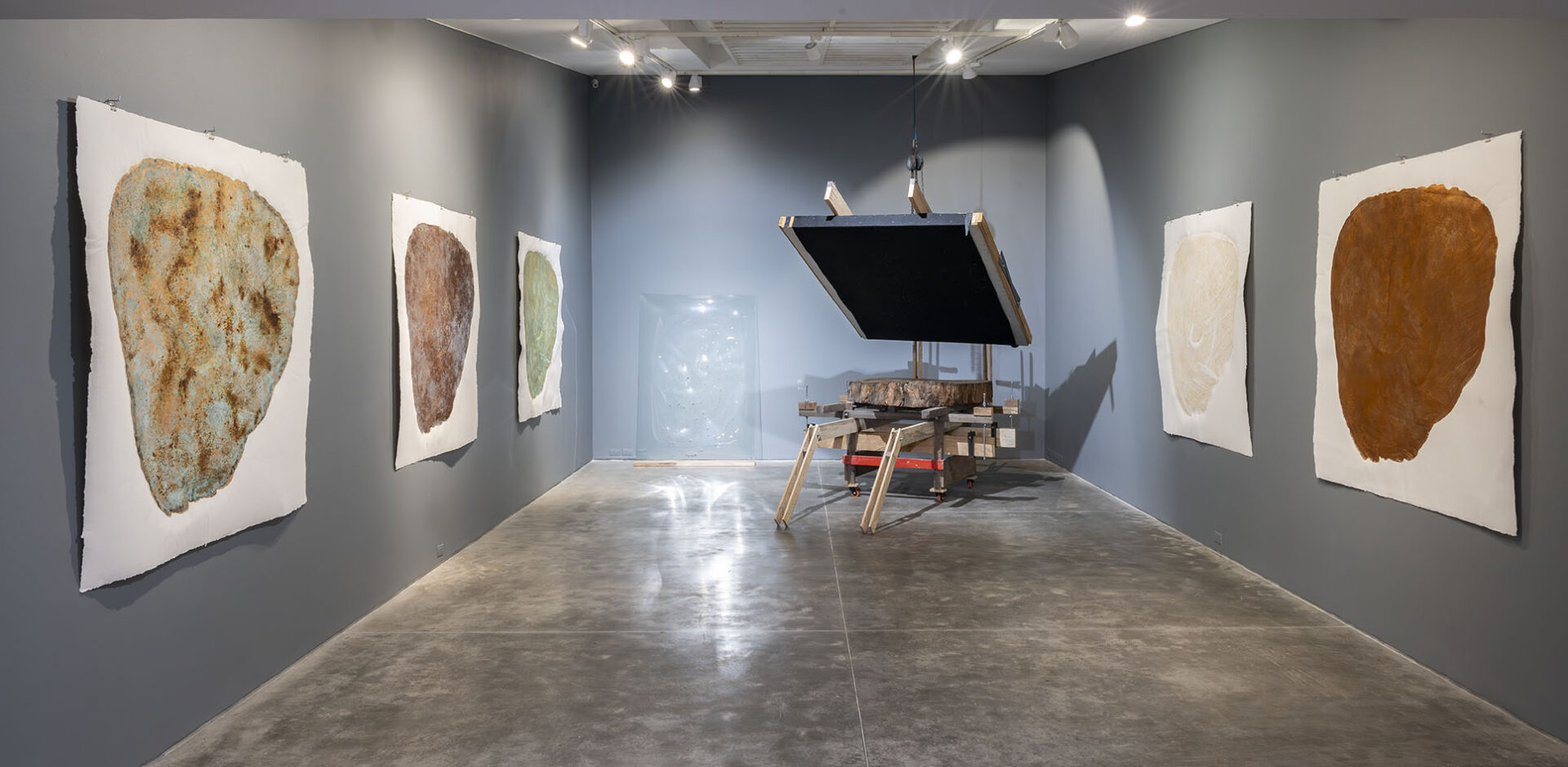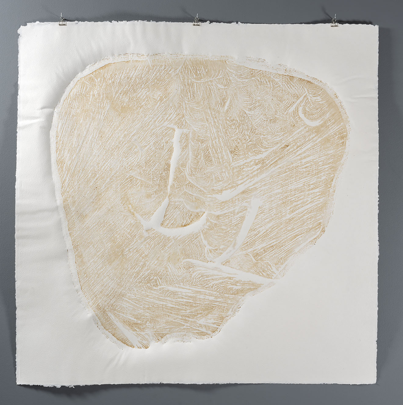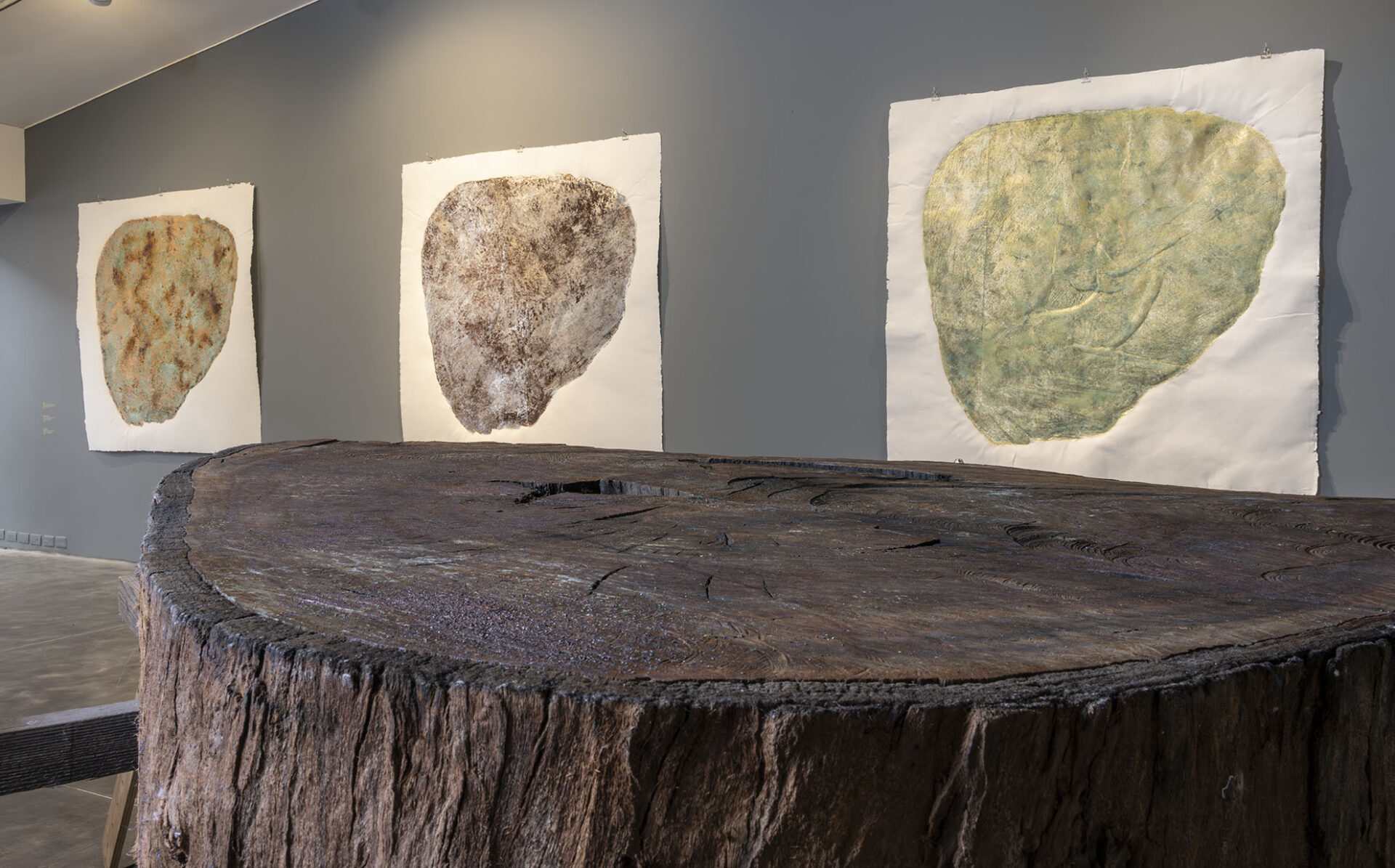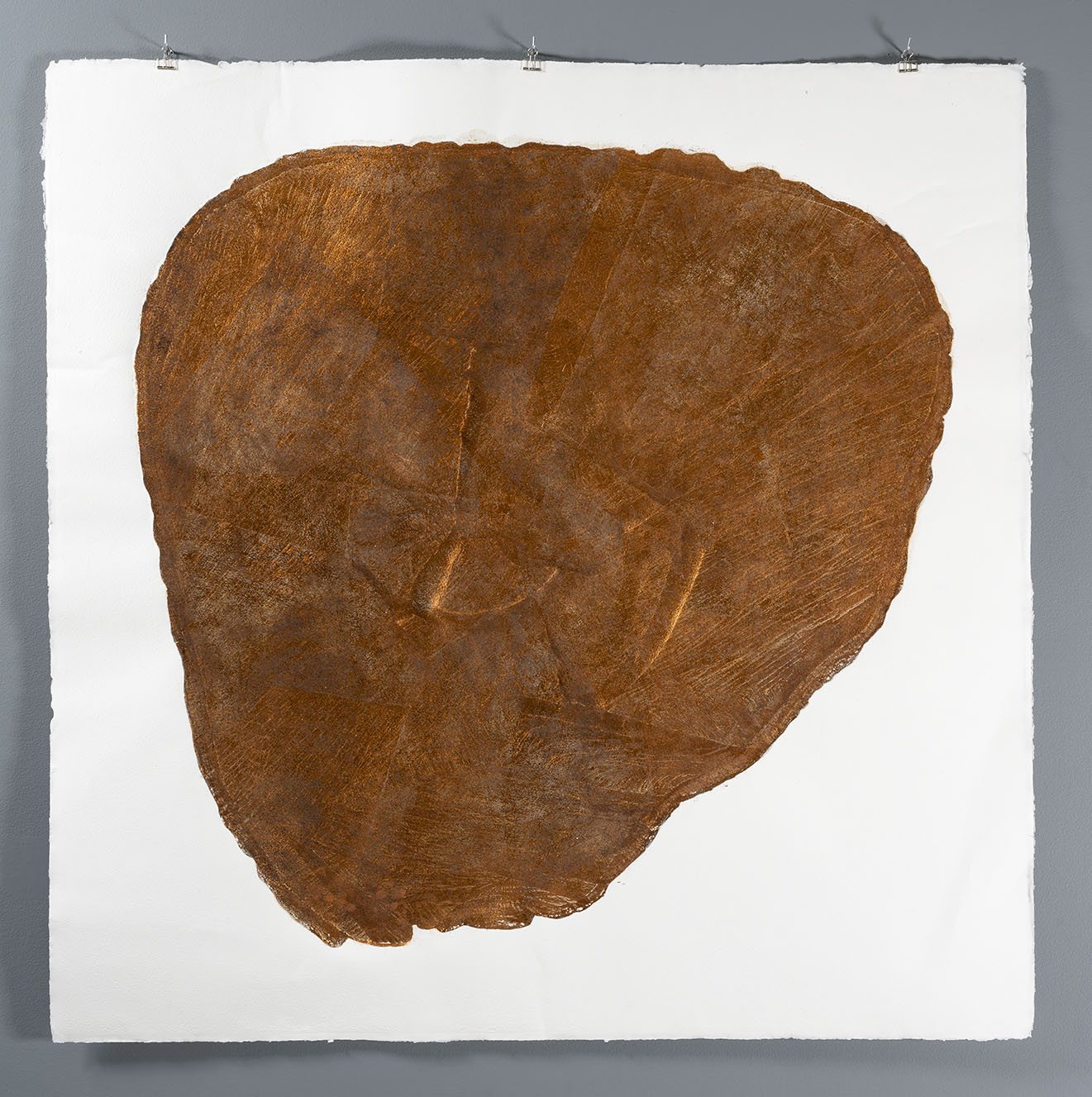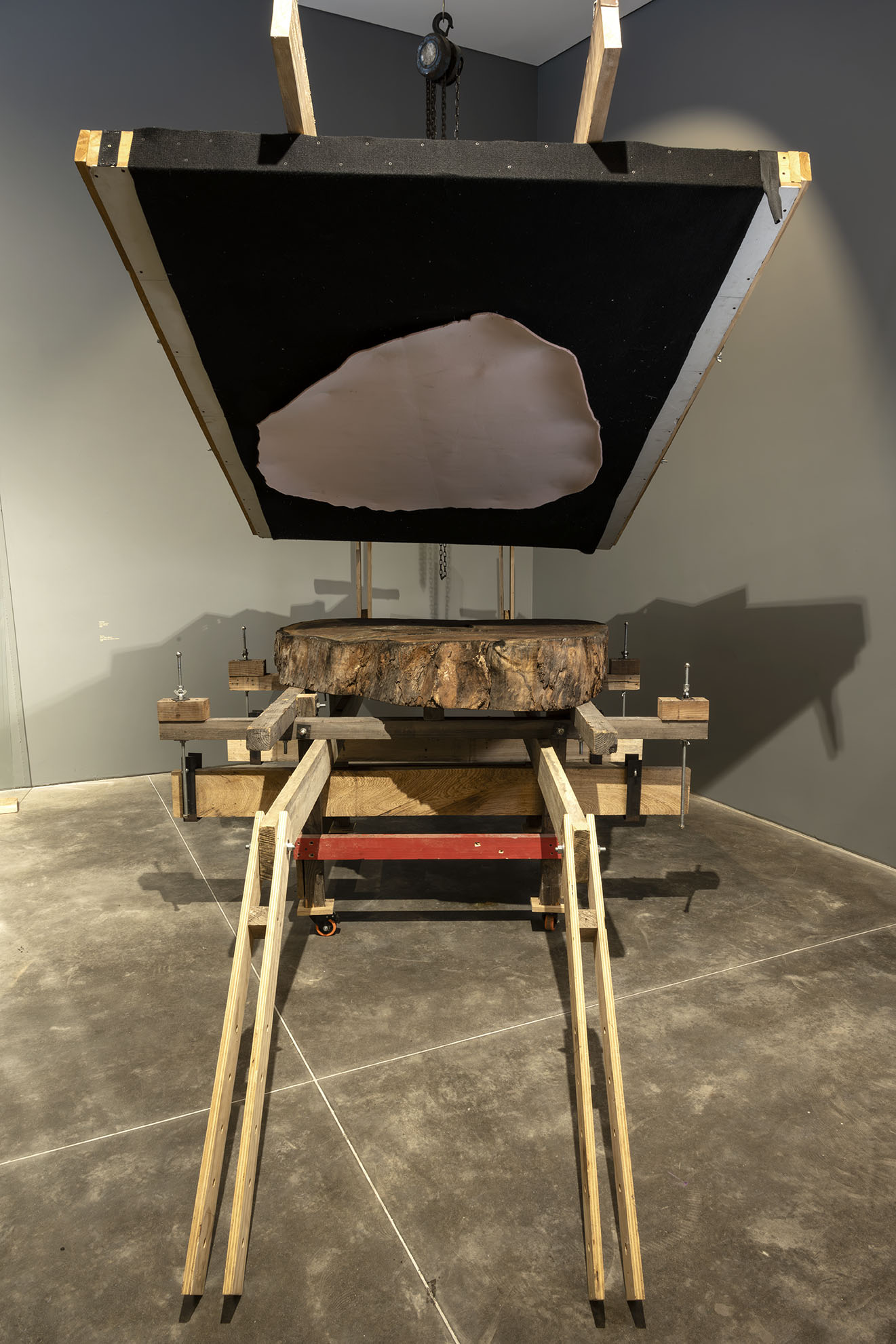 Using a large-format paper specially crafted by Luis Ángel Parra and thanks to the important support of PLART, Lagos embarks on an investigation of the traces of metal in wood, leading to the creation of woodcuts in which the wood is not carved beyond the saw’s marks. To achieve this, he builds a large-scale printing press, big enough to hold both the powerful trunk and the delicate paper. As material for leaving the imprint, Lagos experiments with different metals, echoing the material of the saw that felled the tree. The result is a constellation of prints, each one unique, created through the passage of gold, bronze, and other metals that are not longer mutilating the tree but paying homage to the age of its veins and inscribing the scars of its felling onto paper.