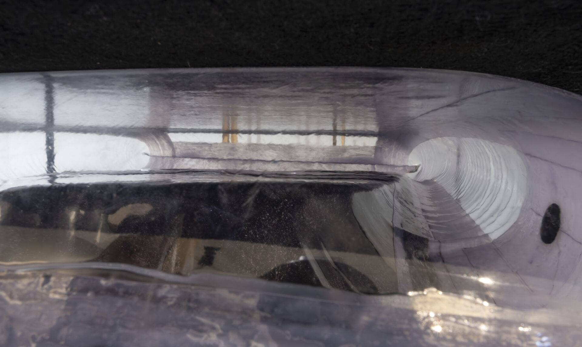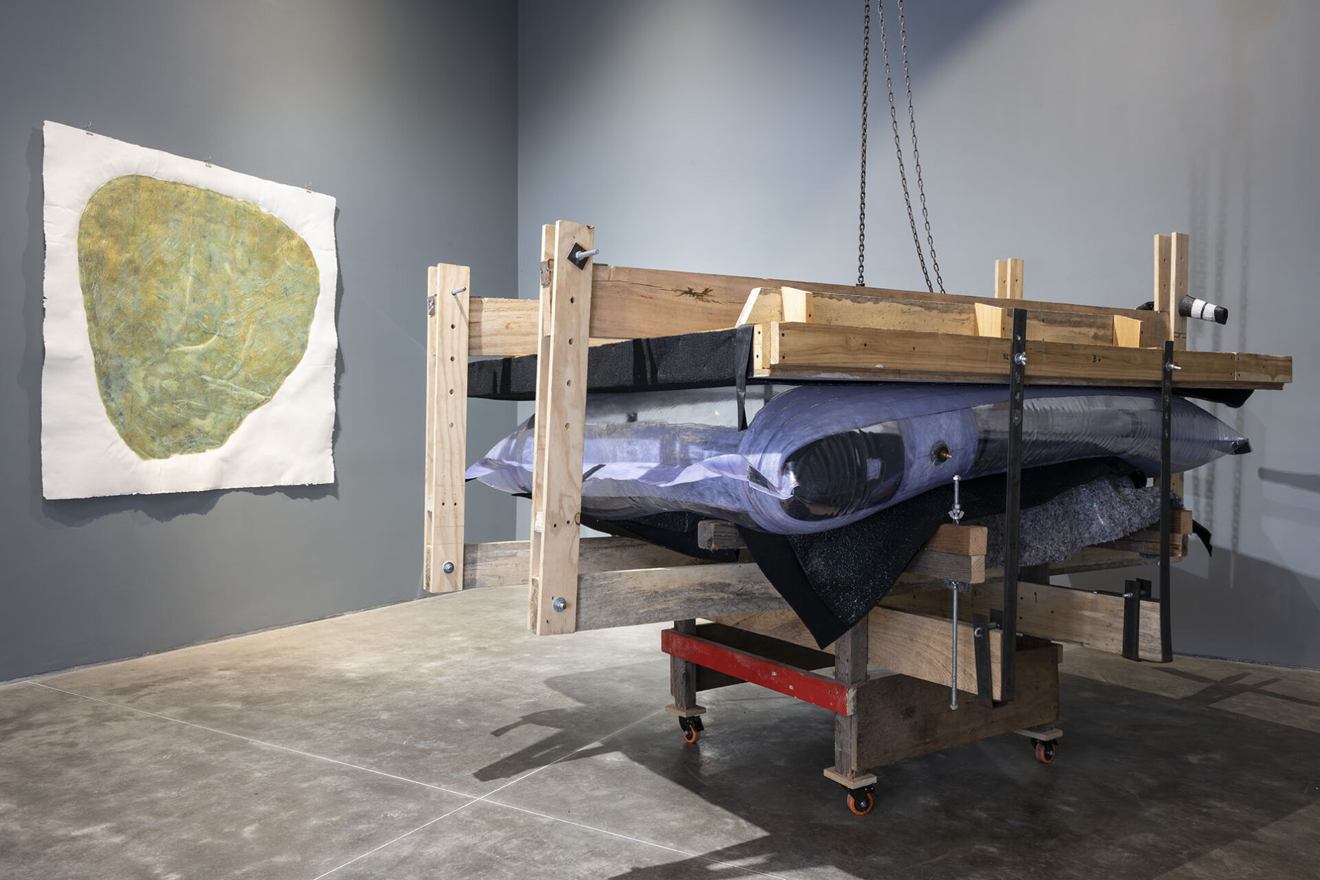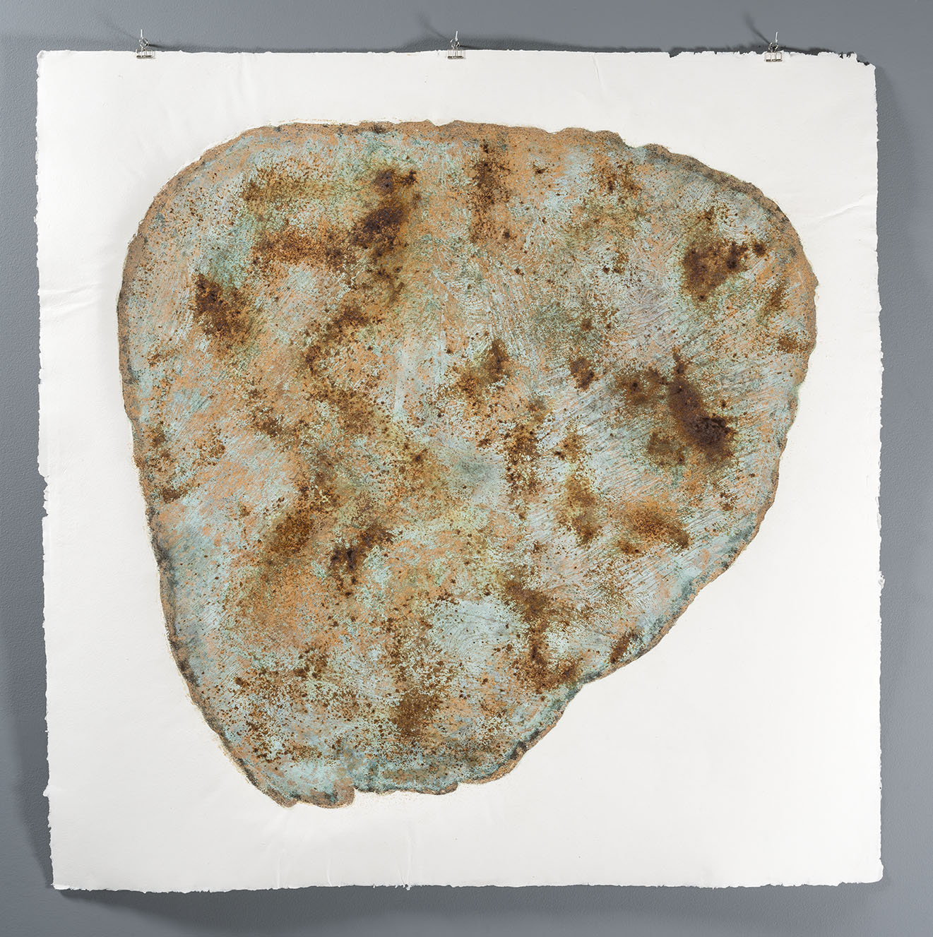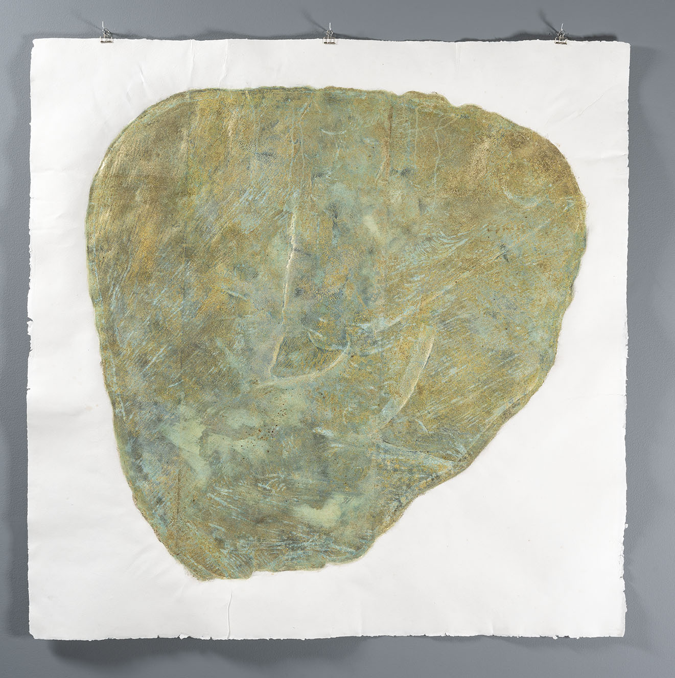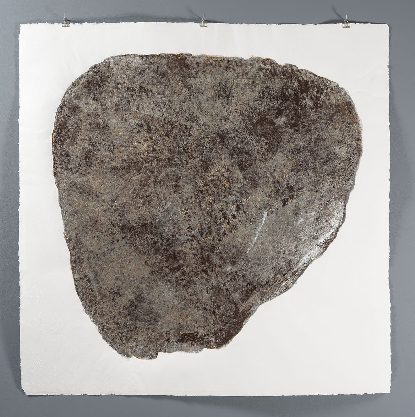 Using a large-format paper specially crafted by Luis Ángel Parra and thanks to the important support of PLART, Lagos embarks on an investigation of the traces of metal in wood, leading to the creation of woodcuts in which the wood is not carved beyond the saw’s marks. To achieve this, he builds a large-scale printing press, big enough to hold both the powerful trunk and the delicate paper. As material for leaving the imprint, Lagos experiments with different metals, echoing the material of the saw that felled the tree. The result is a constellation of prints, each one unique, created through the passage of gold, bronze, and other metals that are not longer mutilating the tree but paying homage to the age of its veins and inscribing the scars of its felling onto paper.