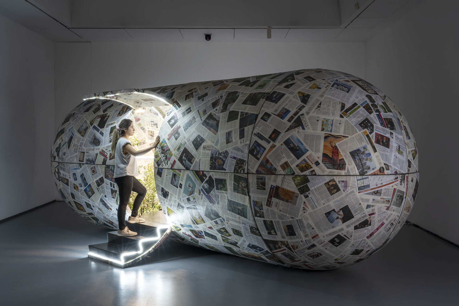 En su interior se crea un espacio para la interacción con información impresa que da testimonio del tiempo transcurrido. Esta estructura frágil plantea una pregunta fundamental: