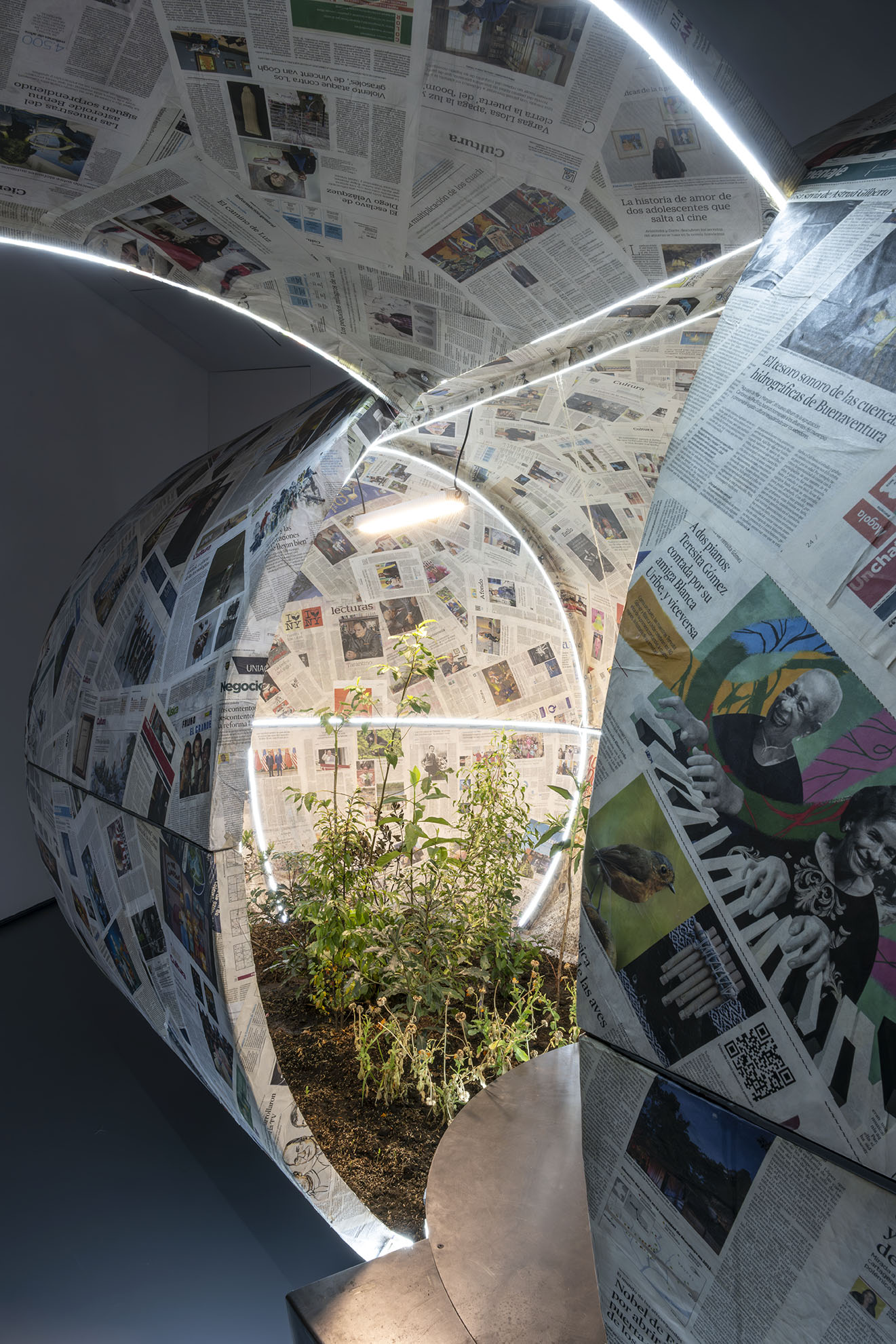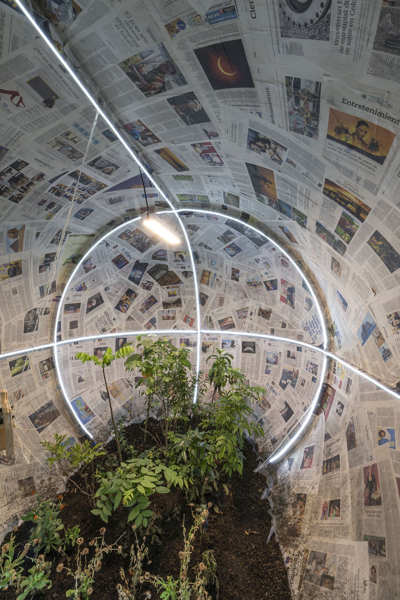 Inside this capsule, alongside the news, live sacred plants and trees from the savannah of Bogotá.