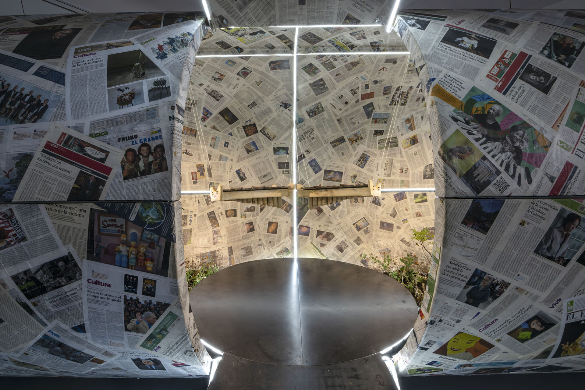 Its outer surface is covered with pages from El Espectador newspaper, while the interior is lined with sheets from El Tiempo.