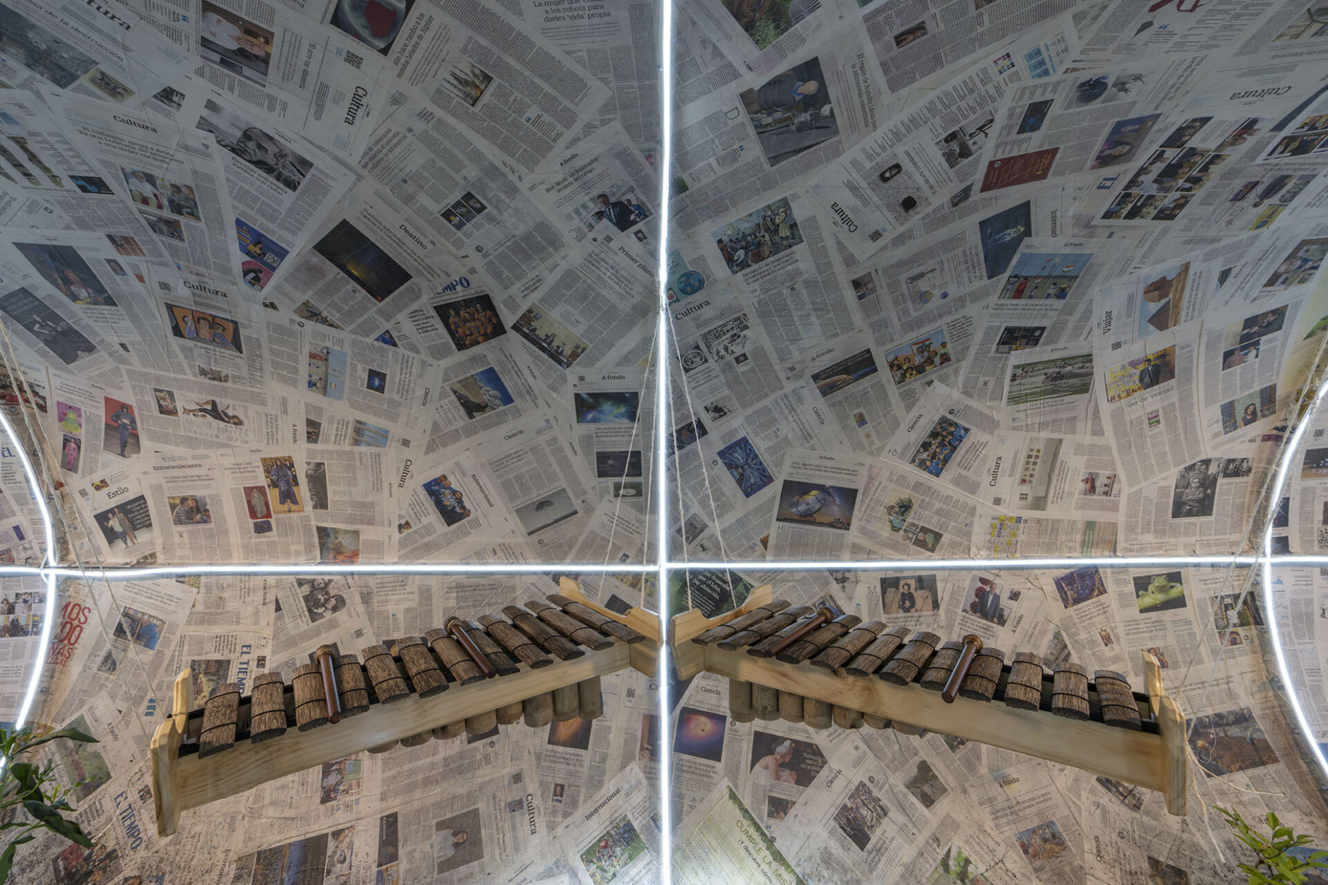 Dentro de esta cápsula, además de las noticias, habitan plantas y árboles sagrados de la sabana de Bogotá. Esta naturaleza viva está acompañada por dos marimbas de chonta, cuyo sonido armoniza el viaje espacial y evoca el fluir del agua.